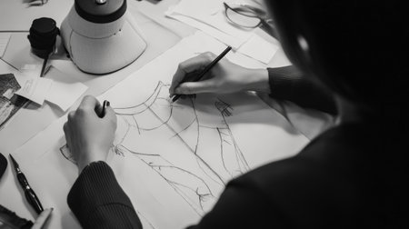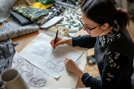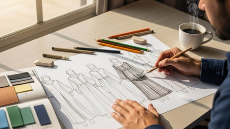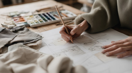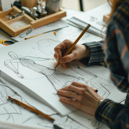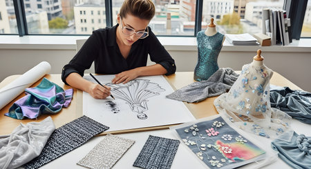 Close-up of a fashion designer sketching a new collection, surrounded by fabric swatches and sewing tools.