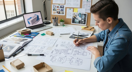 A focused designer meticulously sketches on a large paper, surrounded by design materials and a laptop displaying a 3D model.