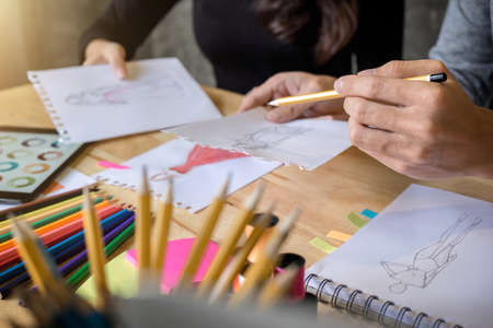 Close-up of two fashion designers drawing sketch of new dress with pencils together