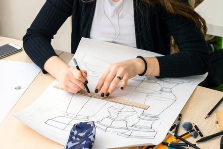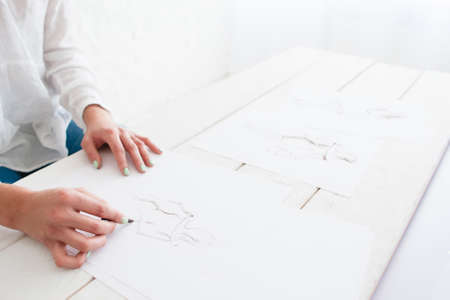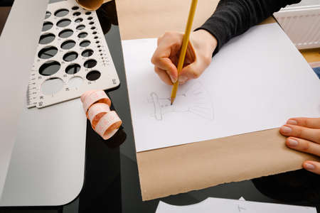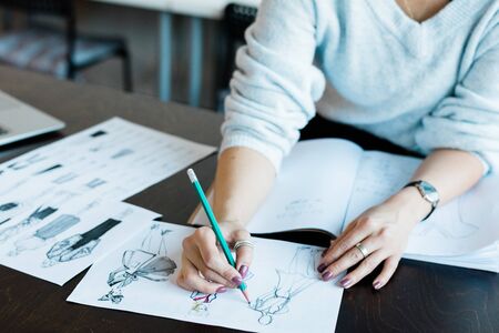 Dressmaker is drawing a fashion sketch. Close up of the hands