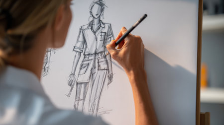 Medium shot of a designer sketching a modern medical uniform focusing on clean lines and functional details for healthcare professionals