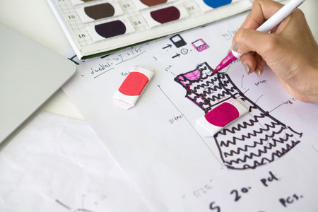 Fashion designer drawing sketches of fashionable clothes on a notebook, using watercolors and markers