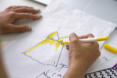 Closeup fashion designer hand use magic pen painting on pattern for cloth.
