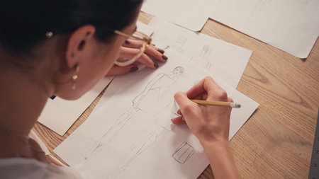 Close-up of unrecognizable woman working on fashion sketch design at table