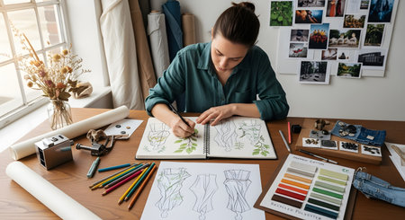 A focused fashion designer sits at a desk sketching botanical-themed clothing designs in a notebook. The workspace includes fabric swatches, pencils, and mood boards, reflecting a sustainable and eco-conscious design process.