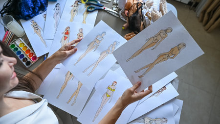 Extreme close up of sketch drawings in tailoring studio showing cool stylish clothing. Skilled couturiers coming up with ideas for upcoming creative fashion design runway show