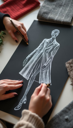 Two hands delicately sketch a stylish fashion figure on a black canvas, surrounded by cozy fabric swatches in warm tones. The scene captures the essence of creativity and design, showcasing the intricate details of the coat and the artistic flair of the sketching process.