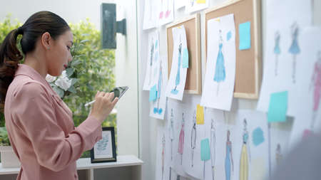 Female Designer Taking Photos Of Designs On Wall With Mobile Phone In Start Up Fashion Business