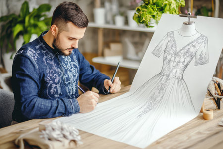 Male fashion designer is sketching clothing designs on paper in a well-lit studio, with fabric samples and illustrations around, highlighting the artistic process and creativity