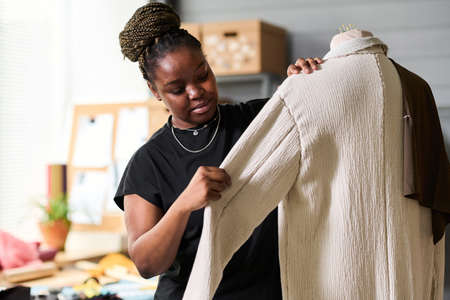 Young seamstress holding sleeve of unfinished coat of delicate color hanging on mannequin while working over client order in workshop