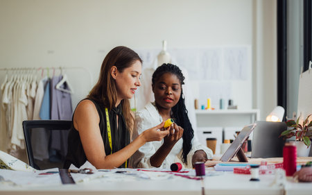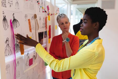 Side view of diverse female fashion designers discussing over sketch design in design studio. This is a casual creative start-up business office for a diverse team