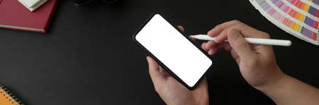 Overhead shot of designer working on smartphone with stylus and designer supplies on black table