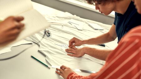 Male hands working with sketches or patterns at studio and preparing fabric. Group of millennials creating clothes together. T-shirt production concept. Horizontal shot. Web Banner