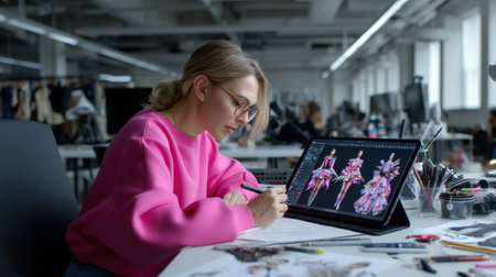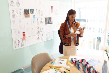 Woman reviewing sketches in fashion studio, with tablet, measuring tape and swatches, copy space. Creative, design, craftsmanship, inspiration, artistry, professional, vibrant