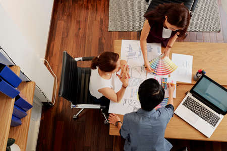 Top view of skilled engineer presenting building plan to smart architect. Top down aerial view of interior designer team working together planning and discussing about house construction. Symposium.