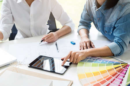 Two interior design or graphic designer at work on project of architecture drawing with work tools and color swatches, colour chart, color samples for selection, renovation and technology concept.