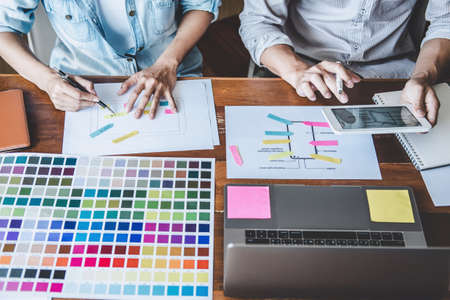 Overhead view team of graphic designer working with color chart and brainstorming for new project.