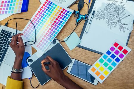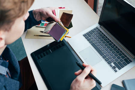 Professional colorist working on a graphic tablet. Design innovations creative projects. Digital media concept