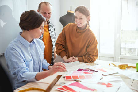 Young female fashion designers working on new collection and choosing color scheme