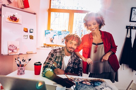Cheerful designers. Male and female interior designers feeling happy and cheerful working together