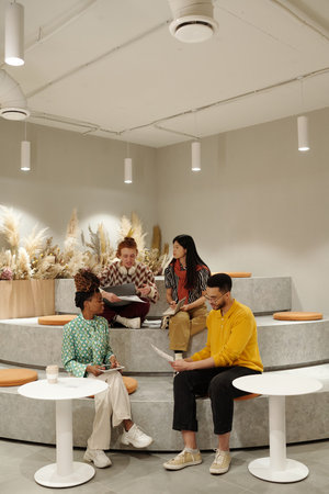 Group of young adult coworkers collaborating on creative project in modern coworking space, discussing documents, sitting on tiered seating