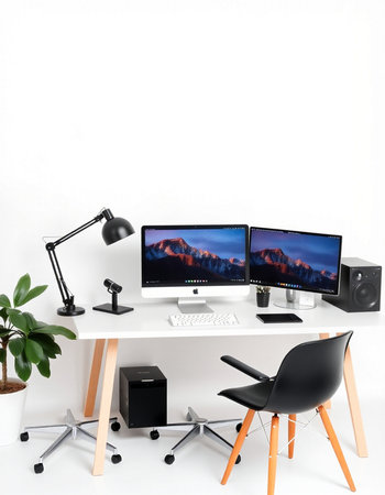 Modern workspace with computer monitors, speakers and chair. 3d render