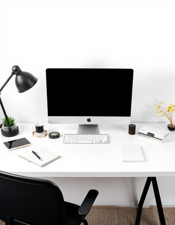 Modern workplace with computer and office supplies on white table.