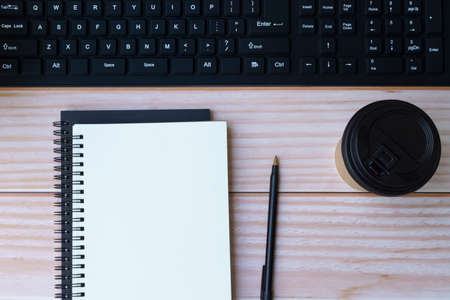 Top view desk,Modern office desk Workspace with laptop computer, coffee cup, glasses,notebook and office supplies for Working background concept.