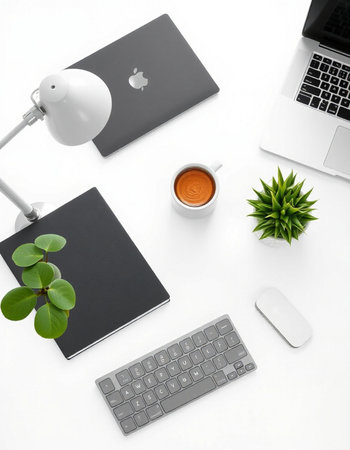 Top view of white office desk with computer, laptop, stationery and plant