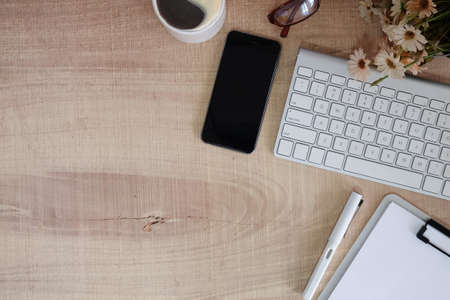 Top view office desk smartphone, mouse , flower , notepad and pen on wood table.Flat lay copy spce.work for home