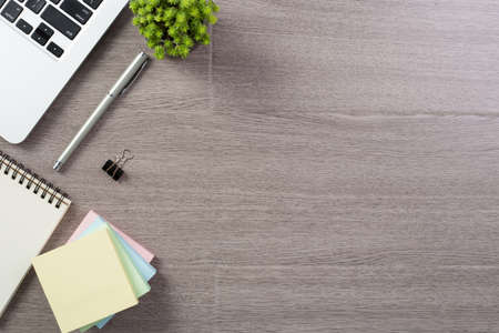 Top view of comfortable workplace with copy space and office supplies on wooden table background