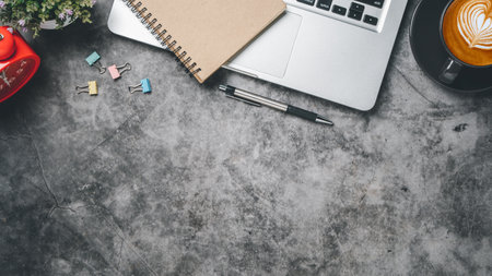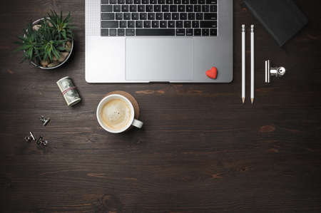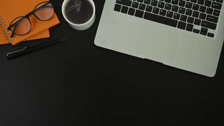 Top view, Dark Office desk with laptop computer, cup of coffee, pen and notebook, copy space, Mock up.