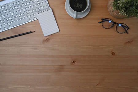 Top view of worktable with blank notebook, coffee cup, glasses, supplies and copy space on the table