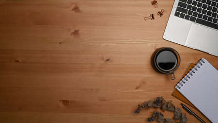 Above view simple workspace with laptop computer, notebook and coffee cup on wooden desk.