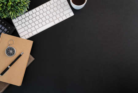 Stylish black office desk top view, flat lay with keyboard, notebook, mug and copy space on black background.