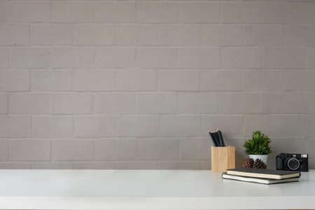 Pencil holder, potted plant, camera and notebook on white table with brick wall. Copy space for graphic display montage.