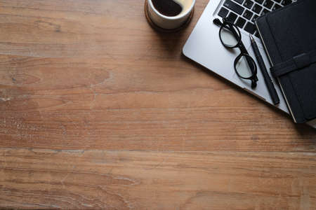 Top view laptop computer, eyeglasses, notebook and coffee cup on wooden table.