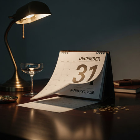 New Year 2020 calendar on office desk with laptop and alarm clock