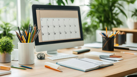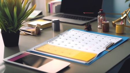 Generative AI : Closeup of calendar timetable event planner work schedule on table in modern office with pencil mobile phone laptop computer and nobody business plan with blurred b
