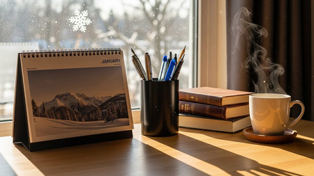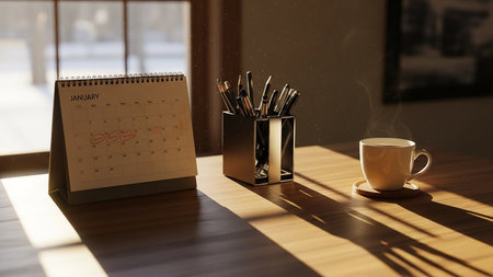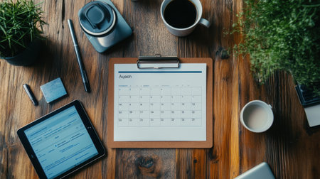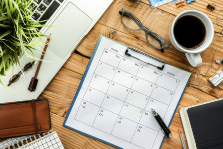 A workspace features a calendar, calculator, and laptop, suggesting planning and scheduling. The scene includes a cup of coffee and scattered items, presented in an overhead composition. The lighting appears soft, indicating an indoor setting. This image is suitable for various commercial uses related to productivity and business.