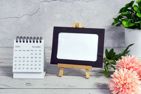 White December 2022 calendar on wooden desk with paper frame and potted plant.