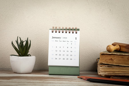 January 2026 Calendar on Wooden Desk. Vintage books, pencils and a small plant on a wooden surface