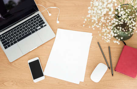 Top view office desk smartphone, mouse , flower , notepad and pen on wood table.Flat lay copy spce.work for home
