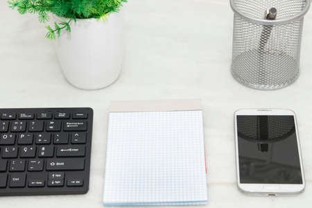 Workspace of a wooden table with a white keyboard, a black smartphone with headphones and a diary