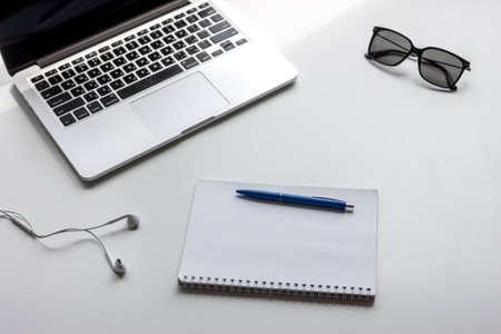 Office supplies on the work desk. A clean white notepad for text. White desktop of a student, banker, office worker. Flat lay. High quality photo