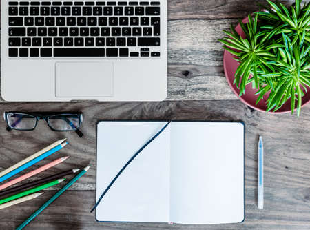 directly above shot of notepad, laptop and green succulent plant on wooden desk