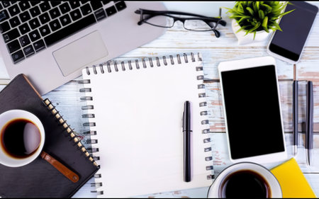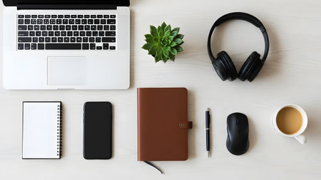 White Notebook, Modem, Earphone, Smartphone, Eyeglass, Coffee, Wireless Mouse at Wooden Desk, Flat Lays or Top View