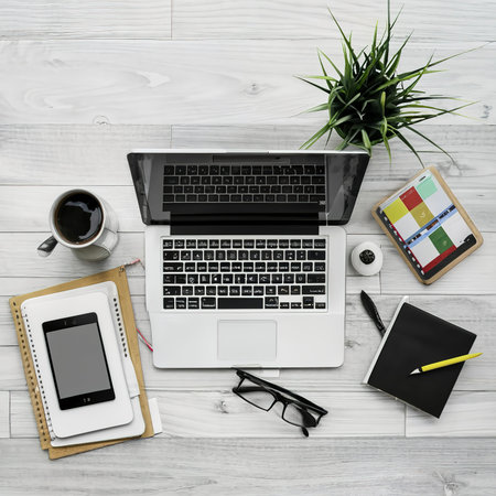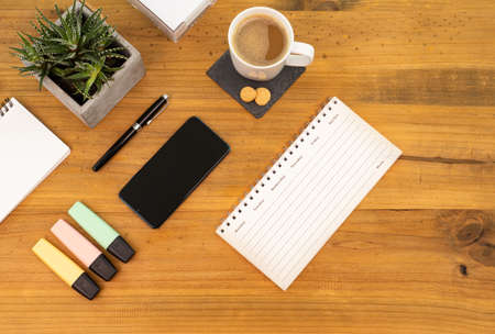 Table Top desk view with pencil a plant, coffee, workspace, mobile display and laptop, calendar