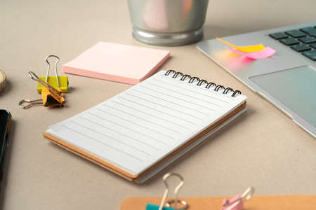 The office supplies and a laptop on a desk to work from home because of Covid-19