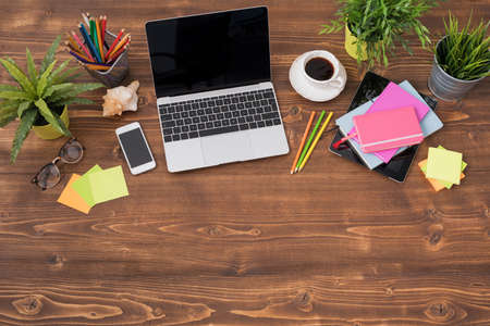 Open laptop computer with office supplies and smartphone on wooden table in comfortable workplace